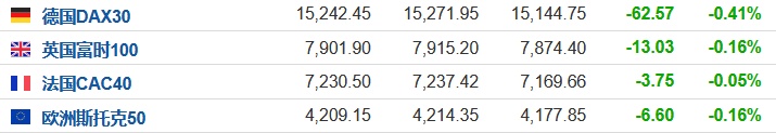 2.截至发稿,德国DAX指数跌0.41%,英国富时100指数跌0.16%,法国CAC40指数跌0.05%,欧洲斯托克50指数跌0.16%。