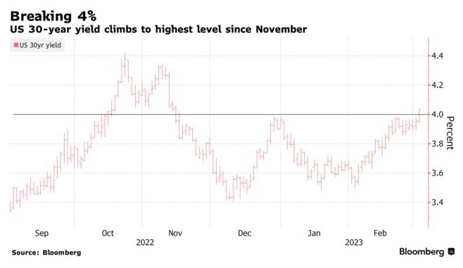 在经历了有记录以来最糟糕的一年后,目前美国国债市场已经抹去了1月份的涨幅,强劲的中国经济数据也刺激了看跌情绪的复苏。周三,10年期国债收益率自去年11月以来首次突破4%,周四升至4.09%。