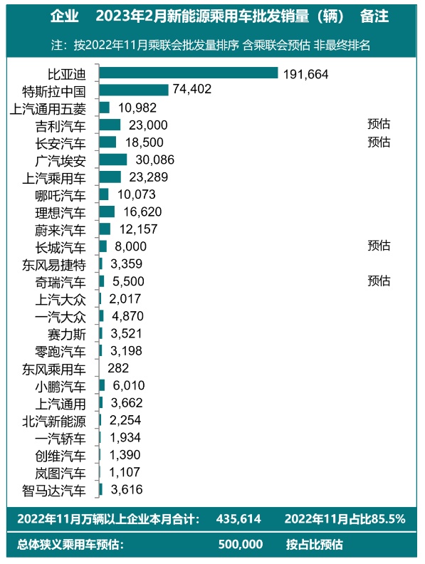 智通财经APP获悉,3月3日,乘联会发布2023年2月新能源乘用车厂商批发销量快讯。乘联会指出,用22年11月主力企业销量占比测算,乘联会2022年11月全国乘用车市场新能源销量万辆以上的14家厂商批发销量占总体新能源乘用车全月销量的85.5%,这些企业的2月预估销量为43万辆,按照正常结构占比预测2月的全国新能源乘用车销量在50万辆,实现春节后开门红。综合预估,2月乘联会新能源乘用车厂商批发销量50万辆,环比1月增30%,同比去年2月增60%。预计2月新能源车市开门红基本实现,实现同比和环比较大幅度增长。