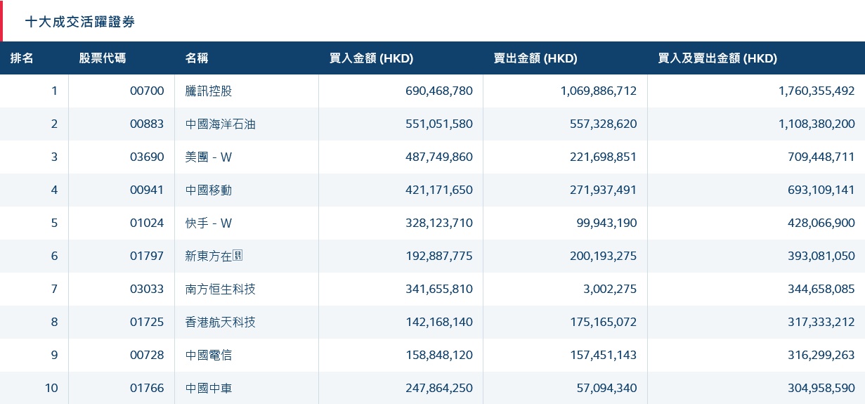 此外,南方恒生科技(03033)获净买入3.38亿港元。而香港航天科技(01725)遭净卖出3299万港元。