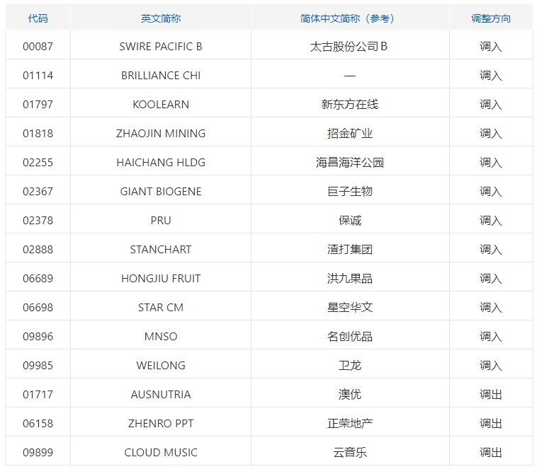 智通财经APP获悉,3月3日,上交所公告称,沪港通下港股通股票名单将发生调整,并自2023年3月13日起生效。因恒生综合大型股指数、中型股指数成份股定期调整,调入太古股份公司B(00087)、BRILLIANCE CHI(01114)、新东方在线(01797)、招金矿业(01818)、海昌海洋公园(02255)、巨子生物(02367)、保诚(02378)、渣打集团(02888)、洪九果品(06689)、星空华文(06698)、名创优品(09896)、卫龙(09985);调出澳优(01717)。