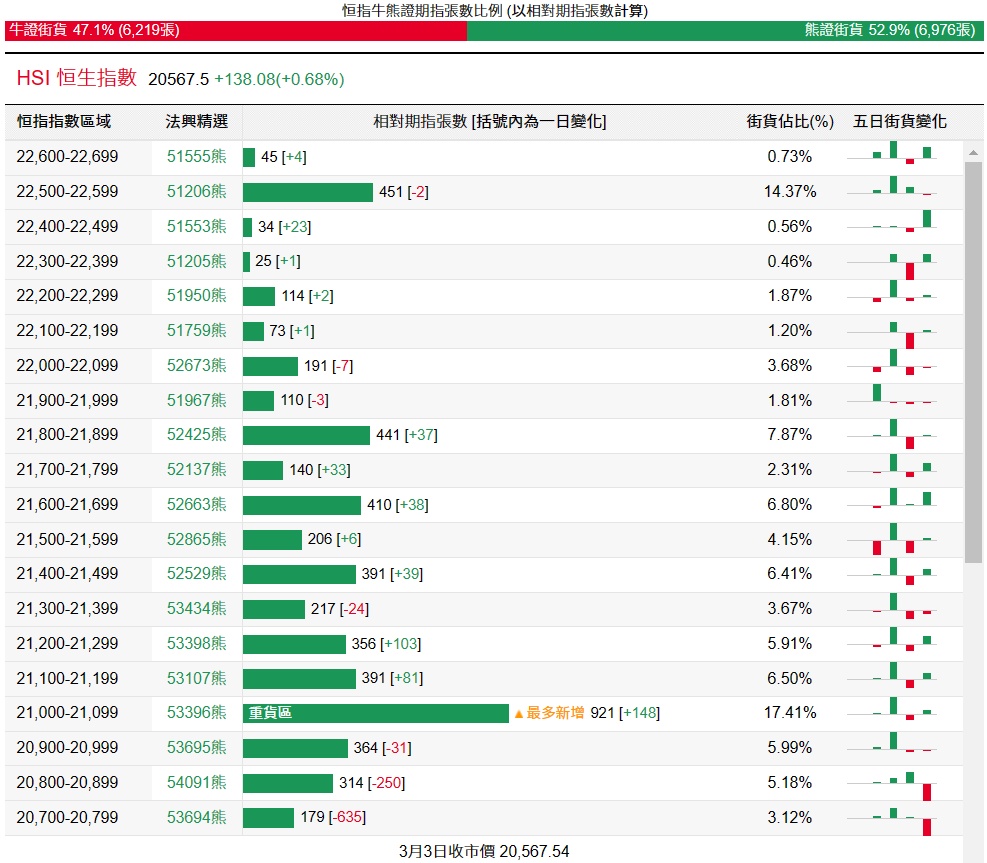 智通财经APP获悉,截至3月4日,恒指最新的牛熊街货比例为47:53。