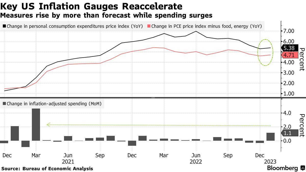 目前,利率市场对美联储终端利率的预期是——将在9月份攀升至大约5.5%,主要因此前有迹象表明美国经济强劲。这些迹象包括,1月的就业增长加速和制造业活动出现改善,并且CPI和美联储青睐的通胀数据——PCE价格指数显示美国通胀依旧火热。