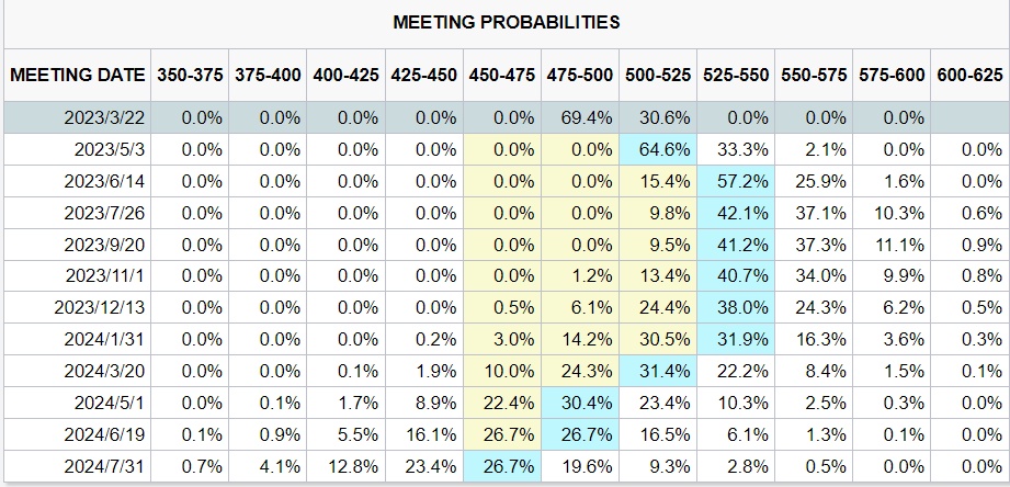不过利率期货市场显示,美联储在3月21日至22日的政策会议上加息50个基点的可能性很小,加息25个基点已被市场充分消化。在上个月,美联储政策制定者将加息速度放慢至25个基点。