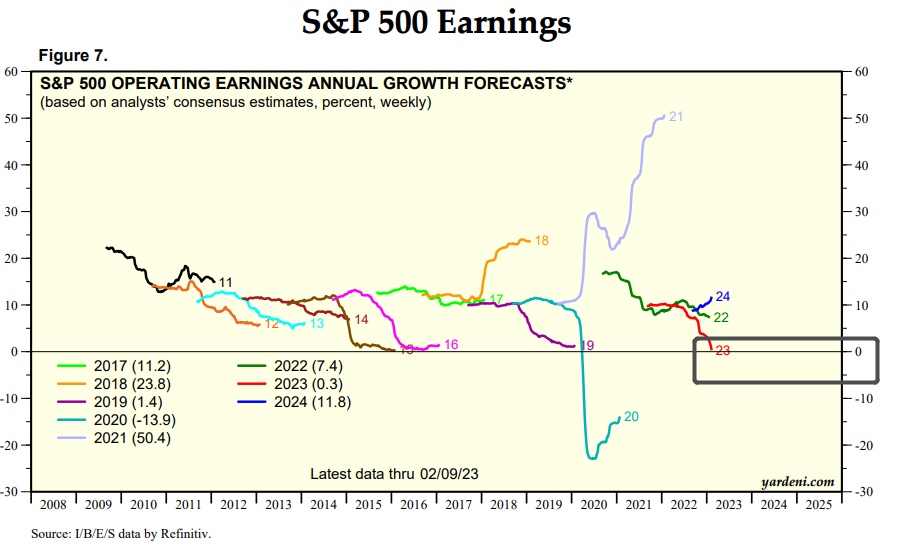 需要注意的是,股市盈利预期一定程度上能够代表分子端的未来现金流折现值。然而实际情况是,由于对经济衰退的担忧日益加剧,华尔街分析师纷纷下调盈利预期。Bloomberg Intelligence统计的预期数据显示,2023年标普500成份公司整体营收增长率预期已从去年6月份的近10%的正增长预测降至负值。Yardeni Research统计的分析师预期数据则显示,分析师们对于2023年标普500成分公司整体营业利润的增速预期已经趋于负值。