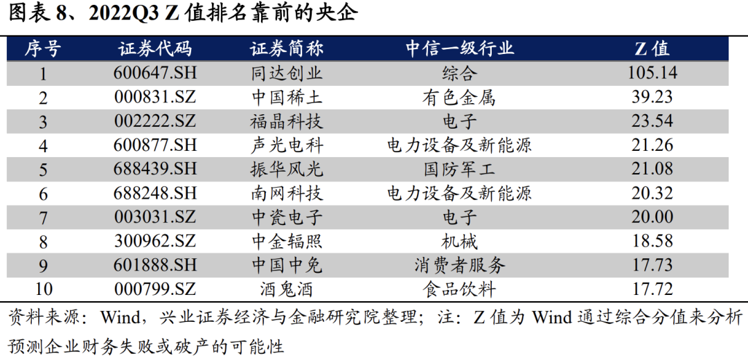《方案》要求央企防范化解重大风险,建议关注Z值靠前的央企。《方案》指出,上市央企要加强风险管控,增强风险识别、分析和处置能力。我们引入常用指标Z值,用以度量央企面临的风险。当Z值小于1.81时,通常预示着企业处于“风险地带”,有潜伏的财务危机;当Z值大于等于1.81、且小于2.675时,则处于“灰色地带”,有一定的财务不稳定因素;当Z值大于等于2.675,则说明企业财务状况良好。基于2022年三季报,我们可计算出各大央企的Z值,并建议关注Z值排名靠前的央企。