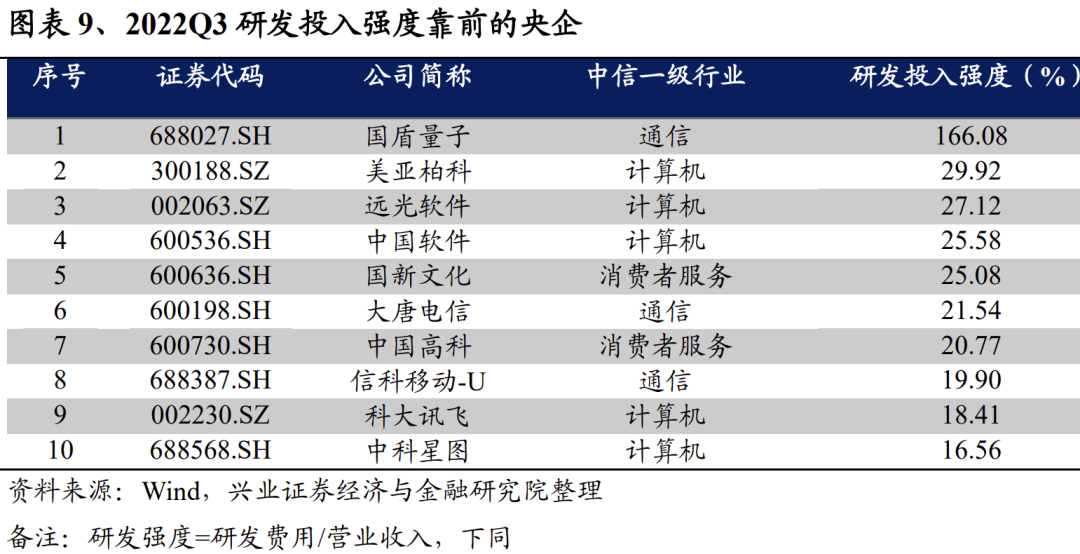 未来央企仍将在科技创新上持续发力,建议关注研发强度居前的央企。2022年,央企在多个领域攻克了一批关键核心技术,重大创新成果持续涌现。包括碳纤维万吨级的48K大丝束碳纤维生产线投产,C919大飞机验证交付、全球首座10万吨级深水半潜式生产储油平台启航等。而《方案》要求2024年央企控股上市公司科技投入强度原则上不低于市场同行业可比上市公司平均水平,建议关注研发强度居前的央企。