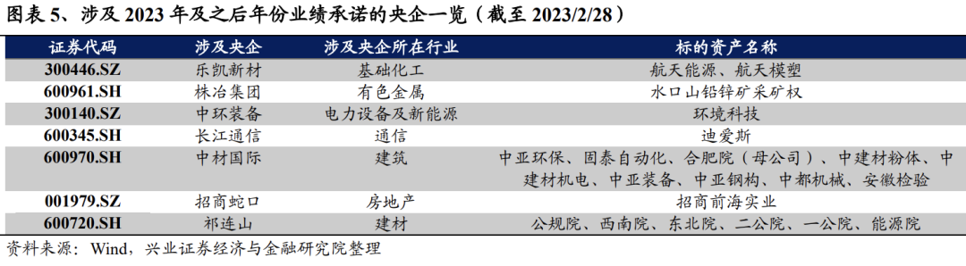 《方案》强调上市央企对资本市场承诺的落实,或可关注央企并购资产业绩承诺的持续兑现。《方案》提出,“涉及资本市场公开承诺事项的,督促上市公司挂图作战、对表推进,切实履行相关承诺”。当前上市公司多在对赌协议中提及业绩承诺,标的公司售股股东(承诺方)向收购方作出承诺。据统计,当前市场上获得标的公司业绩承诺(2023年及之后年份)的央企上市公司共有7家,主要分布在建材、建筑、基础化工、电力设备及新能源等板块中,共涉及14项业绩承诺,后续央企并购的资产的业绩承诺兑现情况值得关注。