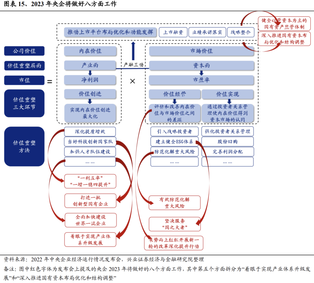 结合从《方案》中梳理出的四条估值重塑路径(产融结合、价值创造、价值经营和价值实现),我们将2023年央企的八方面工作与四条估值重塑路径相对应,可以发现:产融结合环节可以对应“健全以管资本为主的国有资产监管体制”、“深入推进国有资本布局优化和结构调整”;价值创造环节可以对应提质增效稳增长(“一利五率”一稳一提升)、“打造一批创新型国有企业”、“全面加快建设世界一流企业”和“着眼于实现产业体系升级发展”;价值经营环节可以对应“乘势而上组织开展新一轮的改革深化提升行动”、“有效防范化解重大风险”和“坚决服务‘国之大者’”。