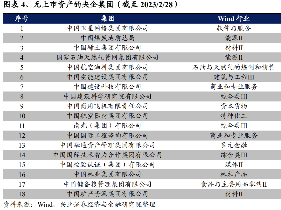 未来或可继续关注央企集团中未上市的优质资源。《方案》提出,“支持各类纳入改革试点和改革专项工程的重点企业,以及在产业链、供应链关键环节和中高端领域布局的企业到相应层次资本市场上市,可注入现有上市公司平台,必要的也可单独上市”。我们梳理了当前的98家央企集团,其中80家央企集团含有上市资产(集团公司本身实现上市或拥有上市子企业),18家央企集团无上市资产(集团公司本身未上市或不拥有上市子企业),未来对应行业的央企集团及子企业上市事件仍然值得关注。