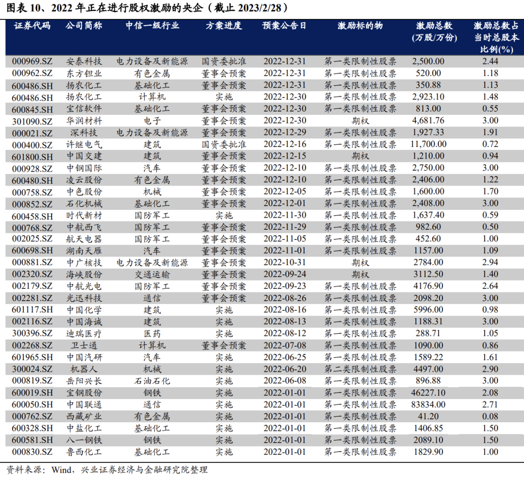 《方案》要求央企加强人才队伍建设,当前正开展股权激励的央企值得关注。近年来与央企相关的股权激励机制持续完善,2019年11月和2020年4月分别发布的《关于进一步做好中央企业控股上市公司股权激励工作有关事项的通知》和《中央企业控股上市公司实施股权激励工作指引》,既使央企股权激励机制不断健全,也在助力央企加强人才队伍建设。建议关注当前正在开展股权激励的央企。