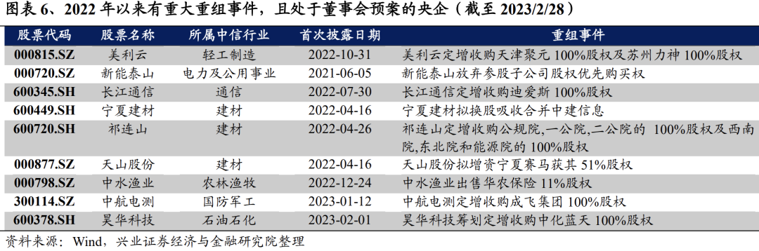 《方案》明确提出要“加大专业化整合力度”,未来或可继续关注央企专业化战略整合进展。《方案》提出,要“加大专业化整合力度”,易会满主席的金融街讲话也着重强调了“加强专业化战略性整合”,后续央企战略性重组和专业化整合行为或将继续提速。2022年以来,截至2023年2月28日,共有11家央企上市公司披露重大资产重组事件的董事会预案,并分布在建材、建筑、电力及公用事业、轻工制造、通信等多个板块,未来或可关注后续进展。