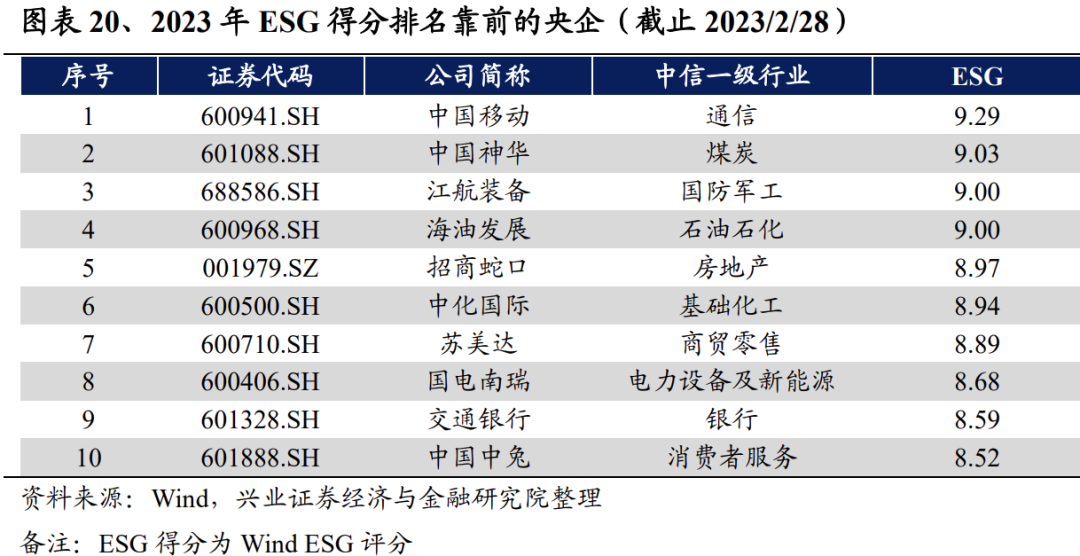 《方案》要求央企探索建立健全ESG体系,建议关注ESG得分靠前的央企。ESG指的是环境、社会责任和公司治理(ESG)工作机制。《方案》指出,央企将在资本市场中发挥带头示范作用,进一步完善ESG工作机制,提升ESG绩效。此外,《方案》还要求央企力争到2023年相关专项报告披露“全覆盖”。建议关注当前ESG得分靠前的央企。