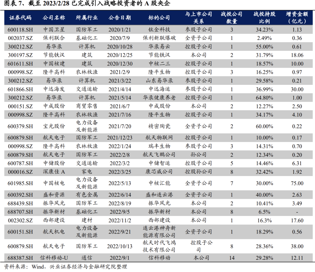 《方案》要求央企引入以战略投资者为代表的积极股东,完善公司治理,建议关注央企引入战投的行为。战略投资者指的是与发行公司业务联系紧密且欲长期持有发行公司股票的法人。继《国企改革三年行动(2020-2022)》强调“鼓励国有控股的上市公司引进持股占5%甚至5%以上的战略投资者,作为积极股东参与治理”后,《方案》也重申了引入战略投资者的必要性,引入的战略投资者将在科研、生产、销售、资本运营等各方面发挥协同作用,因此,建议关注引入战略投资者的央企。