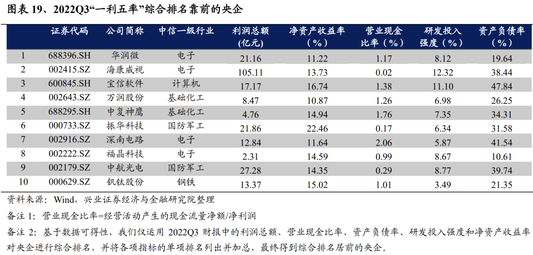 《方案》要求央企提振增效,关注“一利五率”排名靠前的央企。《方案》提出,要“提质增效”,“力争效率效益类指标进一步提升且优于市场同行业可比上市公司平均水平”,以“一利五率”为代表的效率效益类指标体系重要性进一步凸显。“一利五率”将引导企业提升投入产出的效率,优化企业经营业绩。建议关注“一利五率”综合排名靠前的央企。
