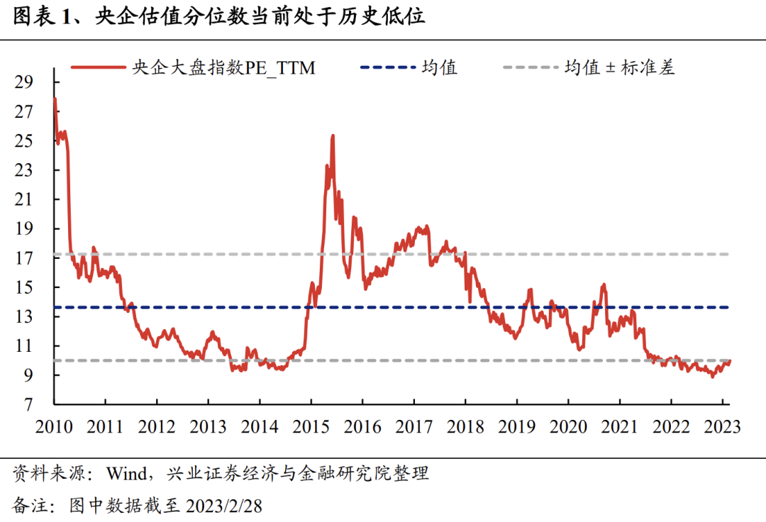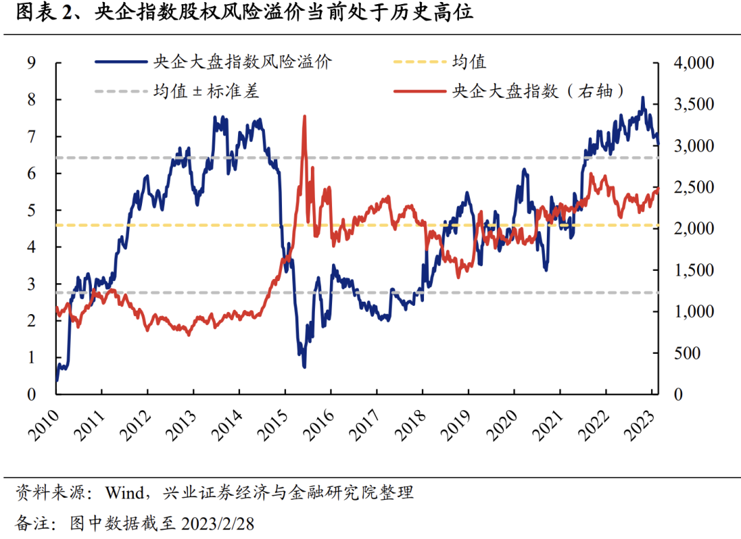 从央企现状看,当前央企的估值水平已经处于历史底部,股权风险溢价也已升至历史高位,具备重塑空间。截至2023年2月28日,央企的流通市值合计19.9万亿元,占A股整体流通市值的比重高达23.4%,接近整体A股市值的四分之一。然而,从估值方面看,万得央企大盘指数的市盈率为9.99倍,明显低于全部A股的17.99倍。并且,从股权风险溢价方面看,万得央企大盘指数股权风险溢价处于2010年以来的85.1%分位,指向当前央企配置性价比凸显。