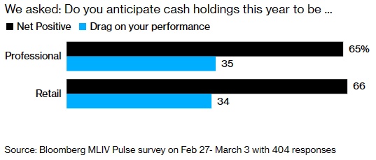 Pulse调查显示,在受访的404名专业和散户投资者中,有三分之二的人认为,他们投资组合中的现金在未来一年将带来净收益,而不会拖累业绩。