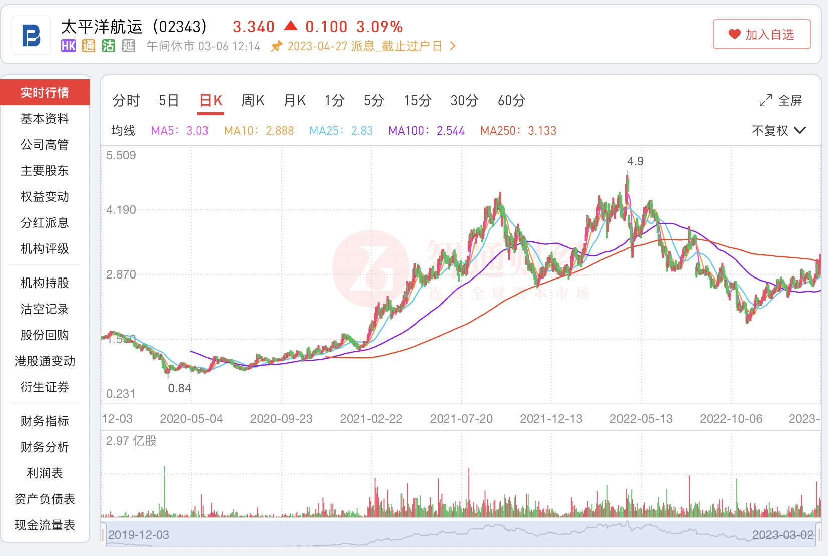 随着BDI上涨,航运股也开始陆续复苏,该板块已连涨三天。在此之中,又以太平洋航运(02343)最受瞩目,三月份以来公司股价已累涨15%。3月6日,公司股价继续上扬,截至午间收市,太平洋航运股价再涨3.09%,报3.34港元。若拉长时间线来看,在去年10月31日创下1.87港元的年内新低水平后,公司股价便开始掉头上行,短短四个月时间,公司股价已涨近80%。