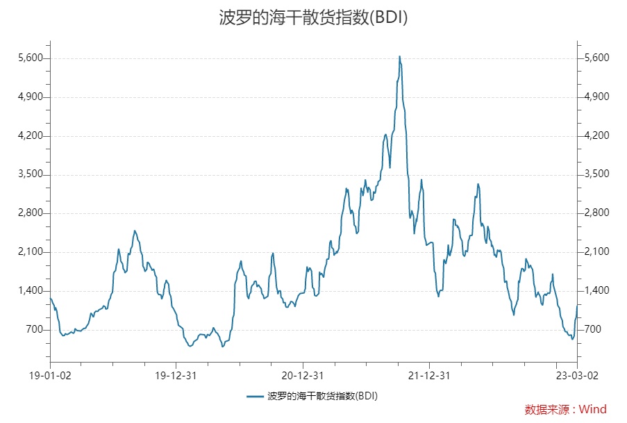 从BDI趋势来看,干散货运价出现了触底回升的走势。在经历了8周的连续下跌后,波罗的海干散货指数(BDI)于2月17日开始连续反弹,并走出了单周37%的涨幅。申万宏源证券指出,考虑螺纹钢、铁矿石已经领先上涨一周,叠加BDI低基数,该行认为后续存在BDI指数连续双位数上涨的可能。