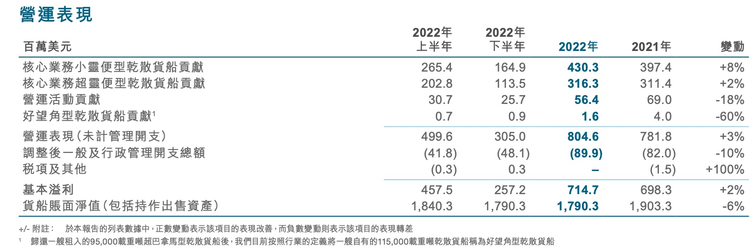 据财报显示,公司保持扩大超灵便船规模、更新小灵便船的长期战略,2022年中公司在船舶价格高点售出部分船龄较高、船型较小的小灵便型船,并在船舶价格回落后购买9艘二手船舶(6艘超大灵便船、2艘超灵便船和1艘小灵便船),公司预计于2023年7月前全部实现交付。截至目前,公司共拥有自有船队现有115艘小灵便型干散货船及超灵便型干散货船,并合共营运约243艘自有及租赁货船。