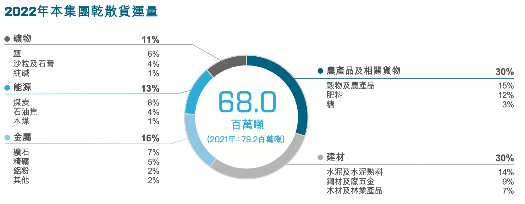 再从货运量来看,2022年太平洋航运的运量为6800万吨,较去年同期的7920万吨为低。从运送货品的类型来看,建材、农产品及相关货物占比最大,均为30%。而金属、能源、矿物则分别为16%、13%及11%。