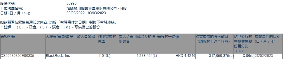 智通财经APP获悉,香港联交所最新资料显示,2月28日,贝莱德增持洛阳钼业(03993)427.8464万股,每股作价4.4246港元,总金额约为1893.05万港元。增持后最新持股数目约为3.17亿股,最新持股比例为8.06%。