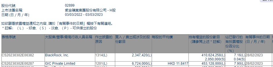 Limited减持紫金矿业(02899)672.4万股,每股作价11.8417港元,总金额约为7962.36万港元。减持后最新持股数目约为4.53亿股,最新持股比例为7.9%。
