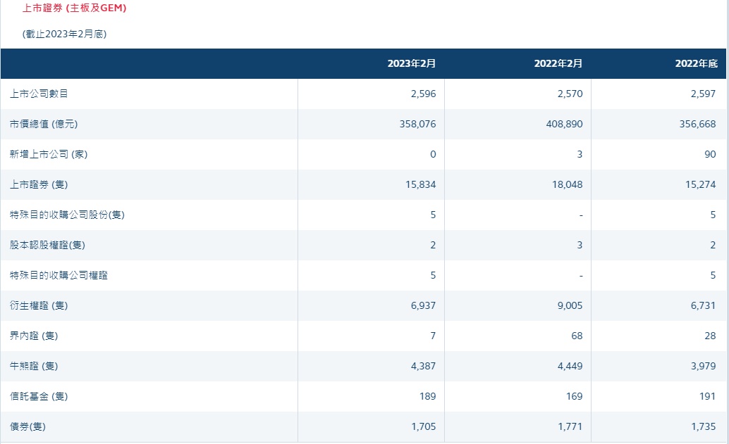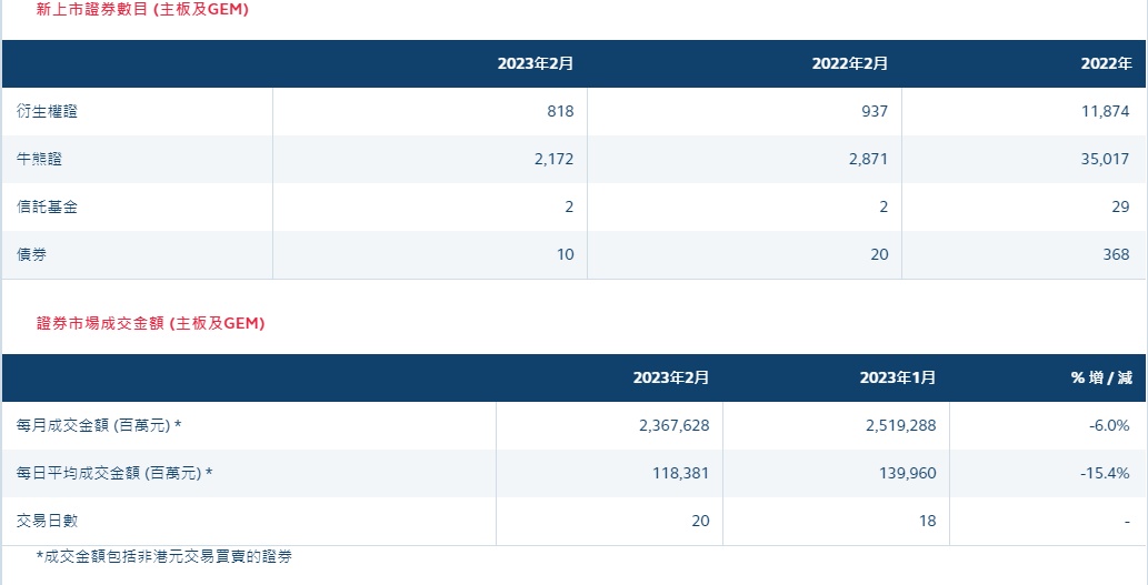 衍生产品市场方面,2023年首两个月的期货及期权平均每日成交量为1,361,266张合约,较去年同期的1,165,135张上升17%。2023年首两个月的股票指数期货平均每日成交量为558,119张合约,较去年同期的469,785张上升19%。2023年首两个月的股票指数期权平均每日成交量为148,797张合约,较去年同期的104,752张上升42%。