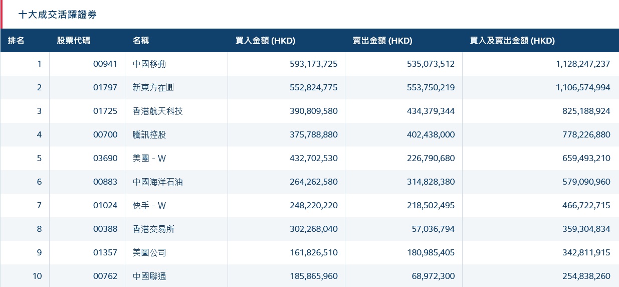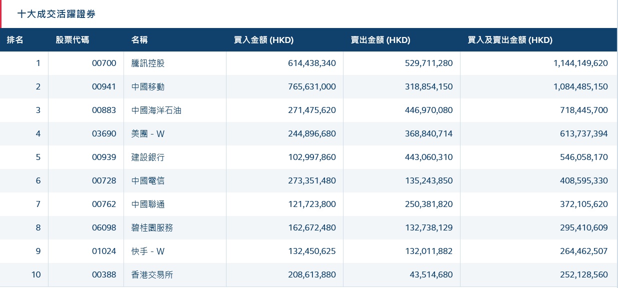 港股通(沪)活跃成交股