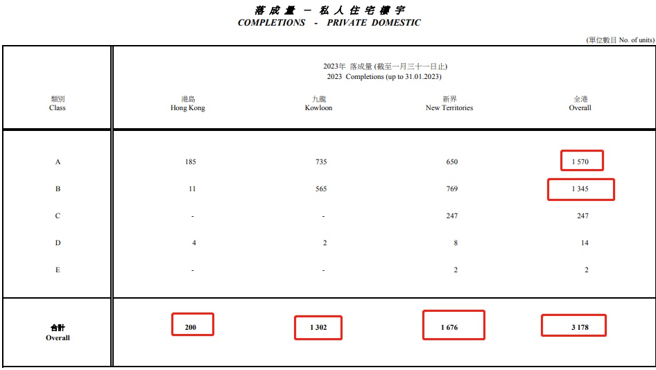 智通财经APP获悉,香港差估署3月6日公布的数据显示,今年1月私人住宅落成量3178伙,较去年12月的1060伙上升近两倍,创近一年新高。按地区划分,月内新界区有1676个单位落成,占近53%;九龙区有1302个单位落成,占约41%;港岛区有200个单位落成,占约6%。按单位面积划分,实用面积431平方呎以下A类细单位有1570伙,占约49%;实用面积431至752平方呎的B类单位有1345伙,占约42%。