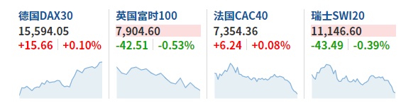 2. 截至发稿,德国DAX30指数涨0.10%,英国富时100指数跌0.53%,法国CAC40指数涨0.08%,瑞士SWI20指数跌0.39%。