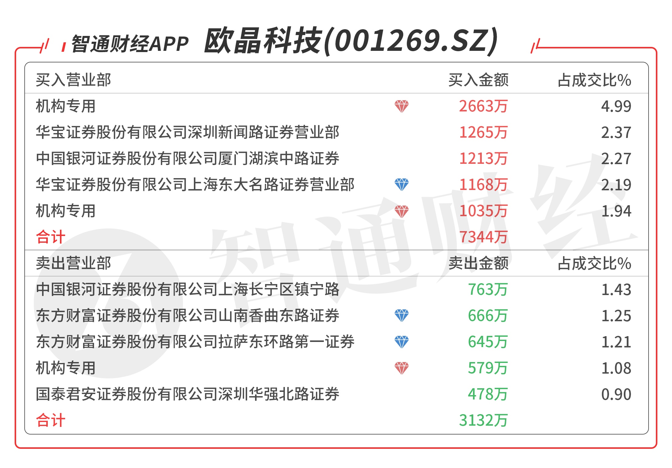 欧晶科技(001269.SZ):受到众多机构青睐,今日共3个机构席位出现在龙虎榜单上,对倒合计净买入3585万元,买四是知名游资的席位买入1168万元,当日净买入4902万元,该股今日突破所有均线,有望冲击近期高点。