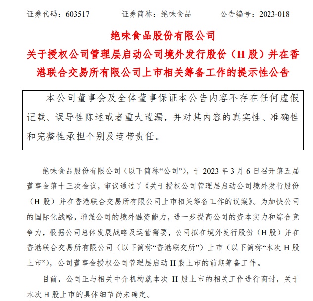 智通财经APP获悉,3月6日,绝味食品(603517.SH)发布公告,公司于3月6日召开第五届董事会第十三次会议,审议通过了《关于授权公司管理层启动公司境外发行股份(H股)并在香港联合交易所有限公司上市相关筹备工作的议案》。为加快公司的国际化战略,增强公司的境外融资能力,进一步提高公司的资本实力和综合竞争力,根据公司总体发展战略及运营需要,公司拟在境外发行股份(H股)并在香港联交所上市,公司董事会授权公司管理层启动H股上市的前期筹备工作。目前,公司正与相关中介机构就本次H股上市的相关工作进行商讨,关于本次H股上市的具体细节尚未确定。