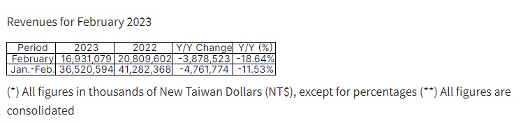 智通财经APP获悉,知名半导体晶圆制造商——联电(UMC.US)3月6日公布的报告显示,2023年度2月未经审计的净销售额为169.3亿新台币,较去年同期减少18.64%;1-2月净销售额为365.2亿新台币,较去年同期减少11.53%。