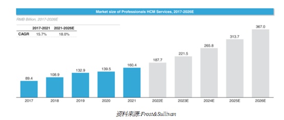 随着疫情的逐渐退去,防控措施逐渐优化,对就业的复苏需求也逐渐提上日程。根据弗若斯特沙利文报告,近年来,随着中国企业数量的增长,市场对HCM(human capital management,人力资本管理)服务的需求也随之增加。而随着技术进步和疫情影响的推动下,企业的数字化转型进程将加速,数字HCM市场规模将快速增长,这将反过来扩大中国专业HCM服务的整体市场规模。HCM市场规模预期将于2026年增至3,670亿元人民币,基于2021年的数字,其复合年增长率达18%。