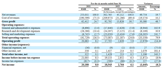 招股书显示,在过去的2020年、2021年,该公司的营收分别为2.30亿人民币、6.52亿人民币,这期间相应的净利润分别为463万人民币、3980.30万人民币,营收实现了翻倍式跃升,净利润亦大幅增长。而在2022年前六个月,该公司实现营收为3.03亿人民币,上年同期为2.53亿人民币,但2022上半年,其净利润由上年同期的2018.8万元下滑至1854.3万元。