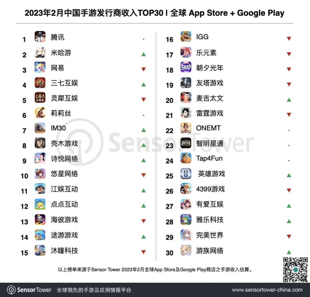智通财经APP获悉,3月7日,Sensor Tower商店情报数据显示,2023年2月共40个中国厂商入围全球手游发行商收入榜TOP100,合计吸金18.5亿美元,占本期全球TOP100手游发行商收入38.1%。随着2月7日胡桃、夜兰祈愿开启,《原神》2月收入达到过去11个月的最高值,重回全球手游收入榜第2名,米哈游移动端收入相应环比增长18.5%。在《捕鱼大作战》、《途游斗地主》等产品的带动下,途游游戏2月收入环比增长15.2%,排名前进6位至榜单第14名。同时,在全球棋牌手游发行商收入榜,途游排行第2,仅次于Playtika。