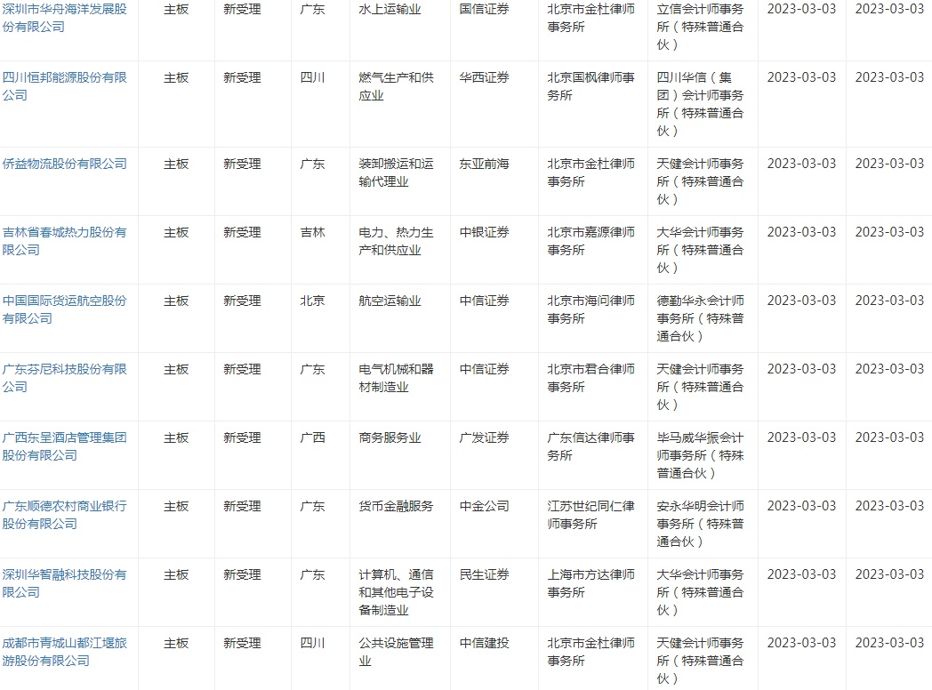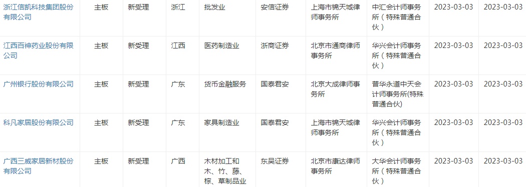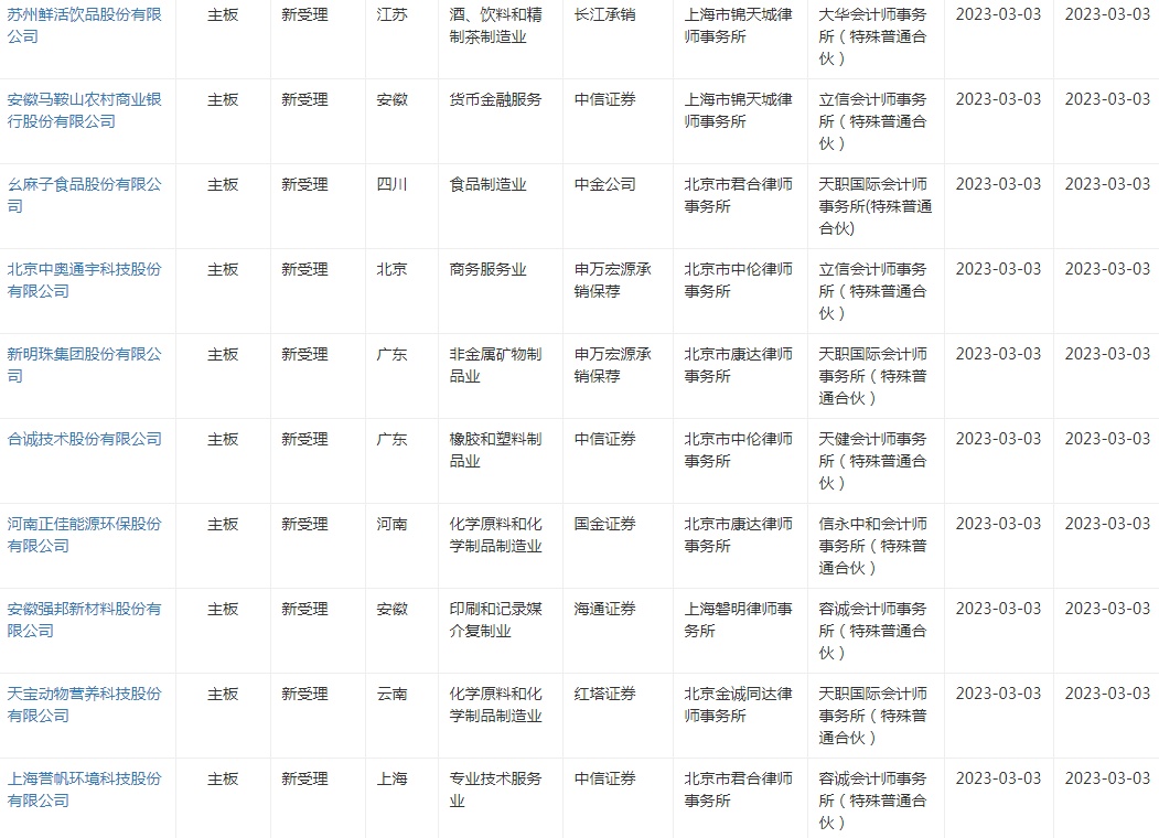 智通财经APP获悉,3月3日,信凯科技、百神药业、广州银行、科凡家居、三威新材、鲜活饮品、马鞍山行、幺麻子、中奥通宇、新明珠、合诚技术、正佳股份、强邦新材、天宝营养、誉帆科技、华舟海洋、恒邦能源、侨益股份、春城热力、国货航、芬尼科技、东呈集团、顺德银行、华智融、青都旅游、浙江中鼎等26家公司申请IPO获深交所受理。