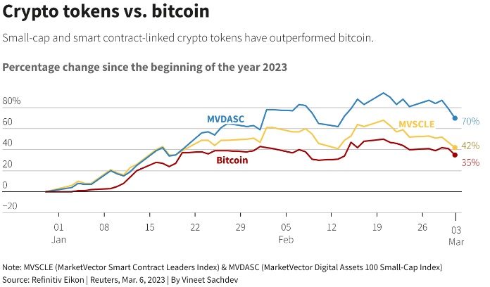 智通财经APP观察到,MarketVector智能合约领导者指数 (MVSCLE)在2023年迄今上涨约36%,这一指数甚至超过了全球最大市值加密货币比特币33%的涨幅。该指数追踪的主要代币包括以太坊、DOT币和Solana币等智能合约代币。其中,Solana币今年以来涨幅达到惊人的76%。