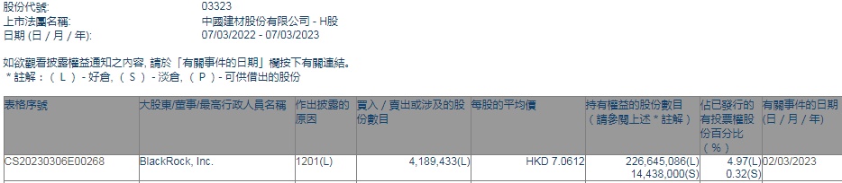智通财经APP获悉,香港联交所最新资料显示,3月2日,贝莱德减持中国建材(03323)418.9433万股,每股作价7.0612港元,总金额约为2958.24万港元。减持后最新持股数目约为2.27亿股,最新持股比例为4.97%。