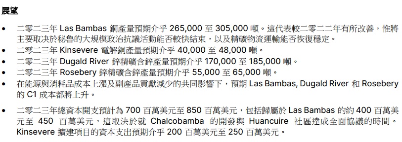 展望未来,2023年,公司预期Las Bambas的铜精矿含铜产量介乎26.5万至30.5万吨。然而此目标主要取决于2022年12月爆发的大规模政治抗议活动能否结束以及精矿物流能否恢复稳定。预计Kinsevere的电解铜产量介乎4万至4.8万吨。预计集团水平的锌产量介乎22.5万至25万吨锌精矿含锌。虽然公司预期成本压力仍然存在,但预计全球对公司产品的需求将保持平稳。