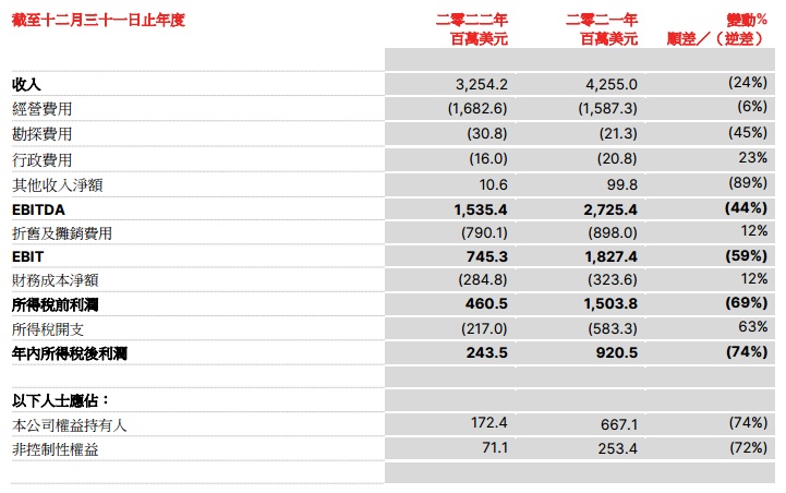 矿山方面,收入为20.868亿美元,较2021年减少30%,乃由于铜(4.827亿美元)及钼(6170万美元)的销量减少以及较低的已实现商品价格(3.46亿美元)。