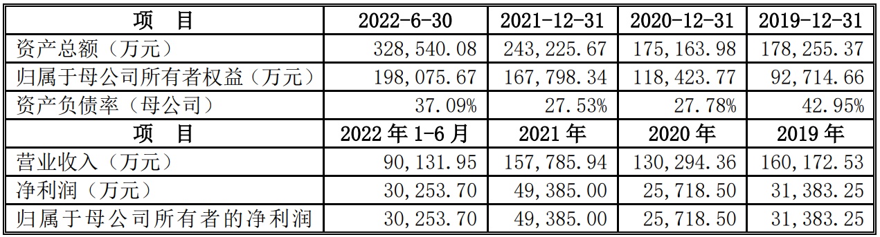财务方面,于2019年度、2020年度、2021年度及2022年上半年度,公司实现营业收入分别约为人民币16.02亿元、13.03亿元、15.78亿元及9.01亿元。同期,公司净利润分别约为3.14亿元、2.57亿元、4.94亿元及3.03亿元。