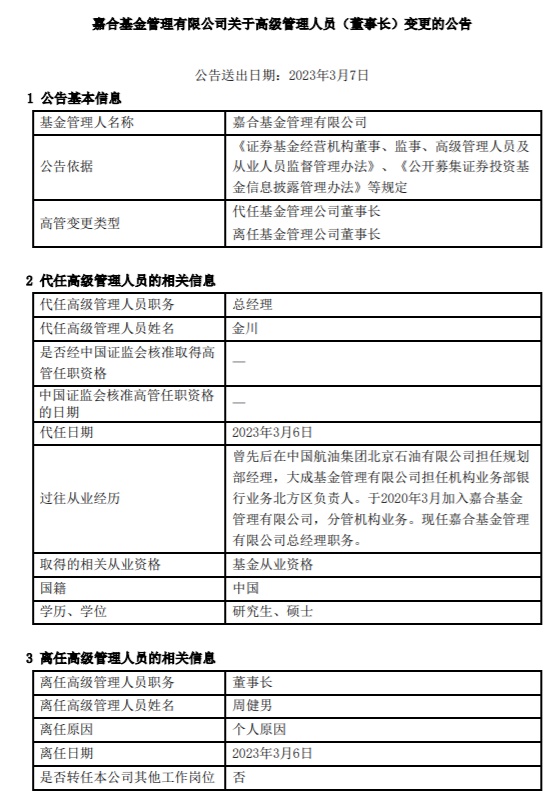 智通财经APP获悉,3月7日,嘉合基金发布了关于高级管理人员(董事长)变更的公告。董事长周健男因个人原因于6日离职,总经理金川暂代任董事长一职。