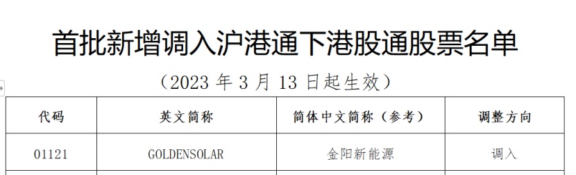 智通财经APP获悉,根据上交所3月3日发布的沪港通股票名单调整公告,金阳新能源(01121)成功进入沪港通下港股通股票名单,下周一(3月13日)起生效。这也意味着,金阳新能源(01121)将进入更多投资机构的视野,同时吸引更多内地投资者的关注和参与,增强了股票流动性,进一步提升公司在资本市场的影响力。