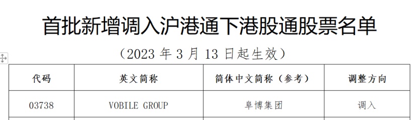 智通财经APP获悉,根据上交所3月3日发布的沪港通股票名单调整公告,阜博集团(03738)成功进入沪港通下港股通股票名单,下周一(3月13日)起生效。