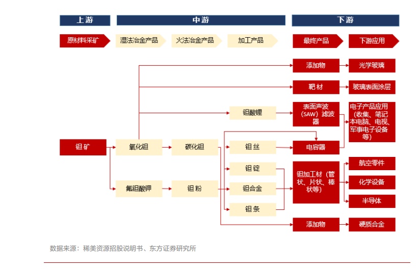 具体而言,稀美资源的产品终端主要覆盖航空、航天、舰艇、5G、半导体、天然气、石油、医疗等行业。该公司为集团企业,下属公司涉及湿法冶炼、火法冶炼及贸易等。其中,稀美资源(贵州)科技有限公司主营熔炼铌、铌铁、含钽铌合金等,主要应用于高温合金领域,而高温合金材料则被广泛应用于航空航天发动机热端部件、石油、电力、核能等领域。