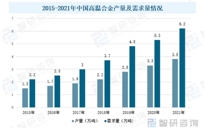虽然高温金属合金材料在我国已发展近60年,但行业发展仍处于成长期。在2015-2021年中国高温合金产量及需求量呈现逐年上涨的趋势,但在此过程中,由于我国生产能力不足,加之我国航空航天、石化等领域对高温合金需求量的增加,导致生产和需求之间存在较大缺口,在2021年中国高温合金产量为3.8万吨,需求量为6.2万吨。