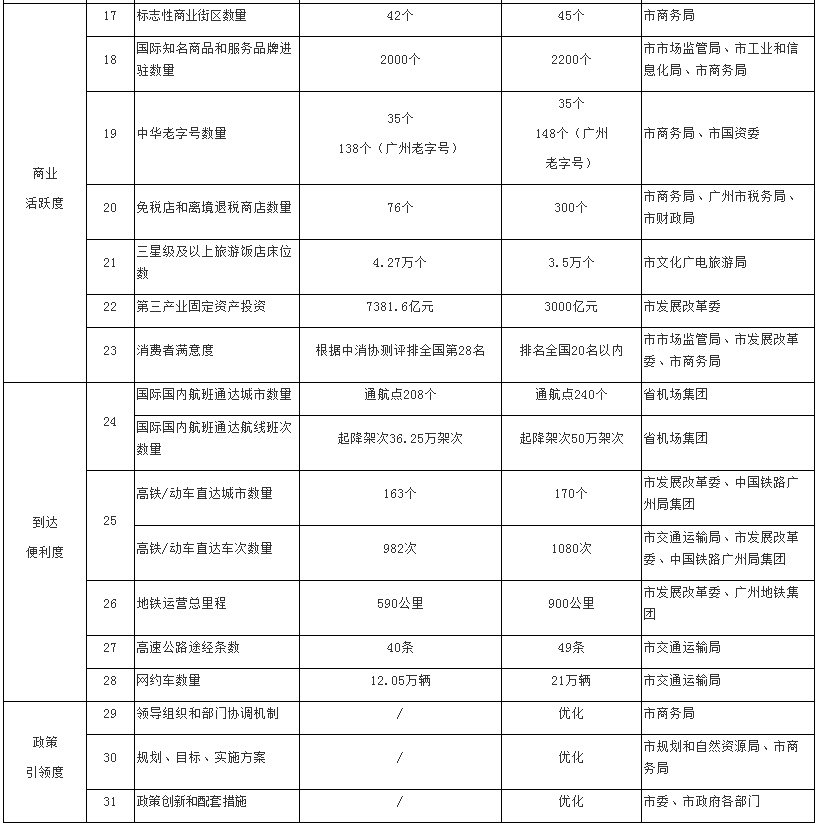 ——提高商业活跃度。建成国际级、城市级、现代社区等层次清晰、便利舒适的现代消费网络体系,建成一批具有全球影响力的标志性商圈,打造一批引领全球消费风向的名节名展,把广州打造成具有国际影响力的时尚文化交汇点、时尚活动荟萃地,建成具有国际影响力的时尚之都。