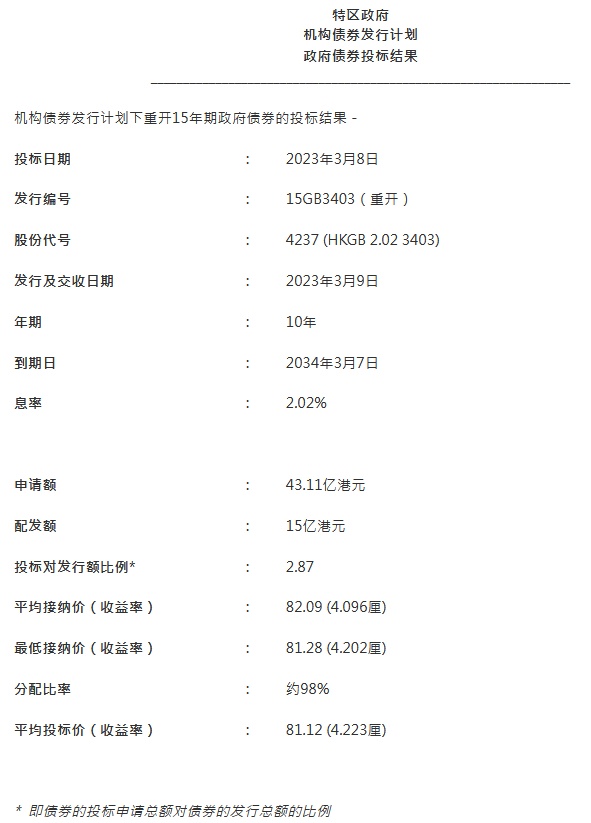 智通财经APP获悉,3月8日,香港金融管理局以香港特别行政区政府(特区政府)代表身份,宣布在机构债券发行计划下,有关重开现有15年期政府债券(发行编号15GB3403)的10年期政府债券投标,已于3月8日举行。今日推出总值15亿港元的10年期政府债券,债券的投标申请总额达43.11亿港元。投标对发行额比例(即债券的投标申请总额对债券的发行总额的比例)为2.87。平均接纳价是82.09,即以年率计的收益率为4.096厘。